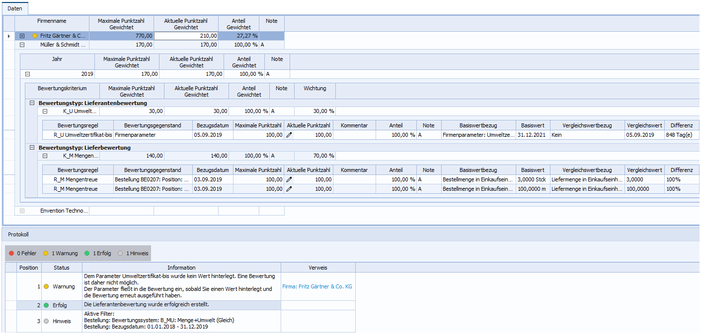Abb.: Details zur Lieferantenbewertung und Protokolleinträge
