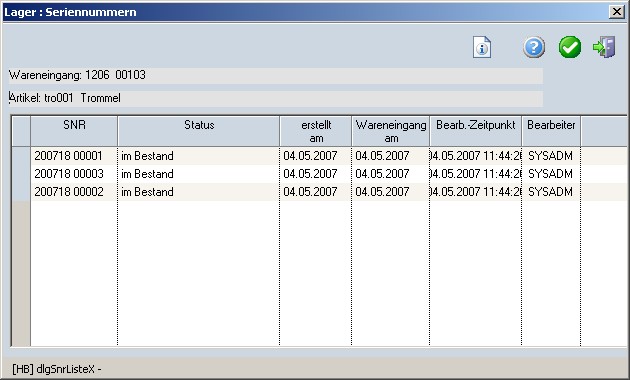 SNR-Info: Ist der markierte Artikel ein Seriennummernpflichtiger Artikel, werden nach dem Buchen die zugeordneten Seriennummern und deren Status angezeigt.