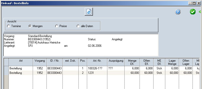 Informationen zur Bestellung: Für eine Position, der eine Bestellposition zugrunde liegt, werden für diese Bestellposition alle zugehörigen Positionen aus Wareneingang, WE-Retour, Rechnungsprüfung, Gutschrift angezeigt. Insbesondere bei komplexen Bestellvorgängen kann so der Fortschritt der Bestellposition einfach eingesehen werden. Es kann zwischen 4 festen Ansichts-Modi schnell umgeschaltet werden: alle Daten – Termine – Mengen – Preise.