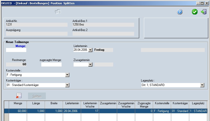 Die Werte der Ausgangsposition werden vorgeblendet. Mit "Splitten" wird die Position in die Tabelle übernommen. Soll eine Position wieder gelöscht werden, muss sie markiert und mit der Schaltfläche "Löschen" entfernt werden. Mit OK werden die Positionen in den Wareneingang übernommen. Abbrechen verwirft die gesplitteten Positionen.