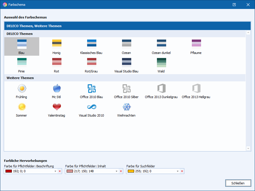 Zur individuellen farblichen Gestaltung der DELECO Benutzeroberfläche stehen verschiedene Farbschemas und Themen zur Verfügung. Per Klick auf die Bezeichnung eines Farbschemas wird dieses für den angemeldeten Nutzer festgelegt. Hinweis: Das DELECO Thema "Blau" ist standardmäßig für jeden Nutzer eingestellt.