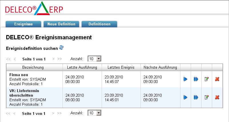 Abb.: Übersicht angelegte Ereignisdefinitionen mit Statusinformationen