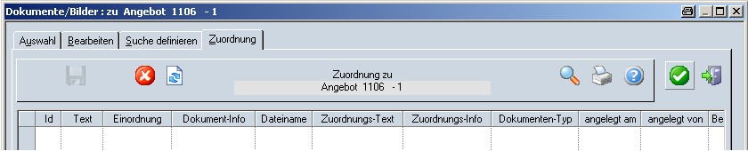 Es kann über "Suche definieren" nach dem entsprechenden Dokument/Bild gesucht werden (siehe Dokumente und Bilder). In der Tabelle ist eine Mehrfachauswahl möglich. Mit der Schaltfläche "Zuordnen" werden die Dokumente/Bilder dem Vorgang zugeordnet und in der Tabelle "Zuordnung" angezeigt. Mit Doppelklick auf einer Zeile wird in die Registerkarte "Bearbeiten" gewechselt.