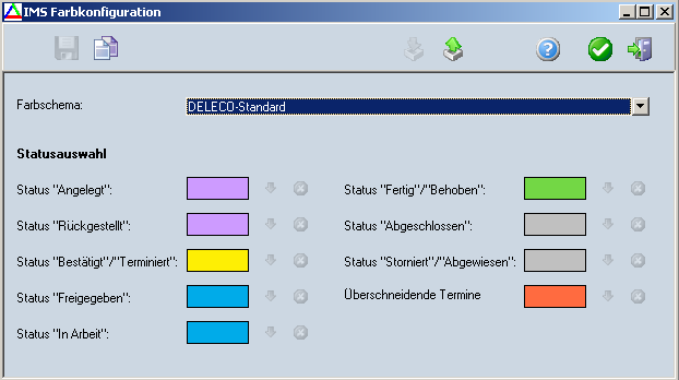 Die Farbgestaltung der Status für die Terminübersicht lässt sich systemweit konfigurieren. Es ist ein Standardschema vorgegeben, welches jedoch angepasst werden kann. Dazu ist das Farbschema "Benutzerdefiniert" auszuwählen. Über die Schaltflächen kann die jeweilige Farbe zugeordnet werden. Die Bedienung funktioniert analog zum DELECO-Farbschema (siehe Farbgestaltung), mit dem Unterschied, dass die Farbeinstellung für die Instandhaltung für alle DELECO Nutzer gilt.