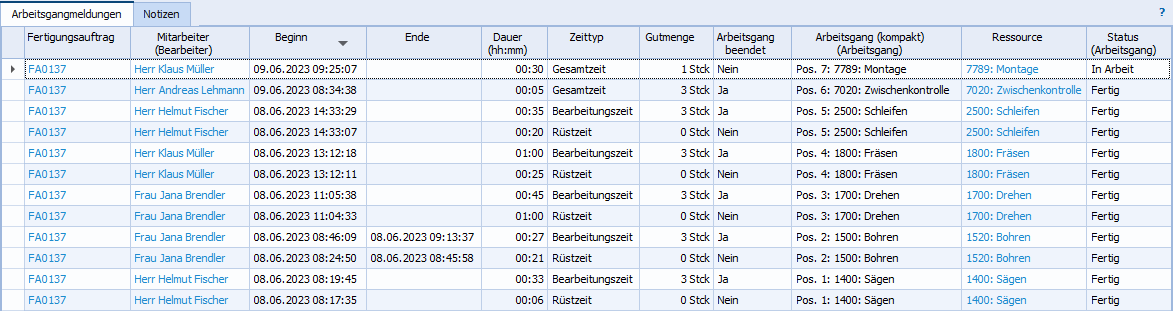 Abb.: Auswertung "Arbeitsgangmeldungen"