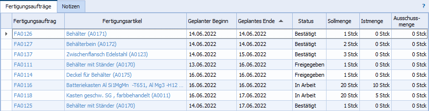 Die Tabelle "Fertigungsaufträge" listet alle Fertigungsaufträge in einer Tabelle auf. Die Fertigungsaufträge sind dabei standardmäßig aufsteigend nach ihrem geplantem Ende sortiert.