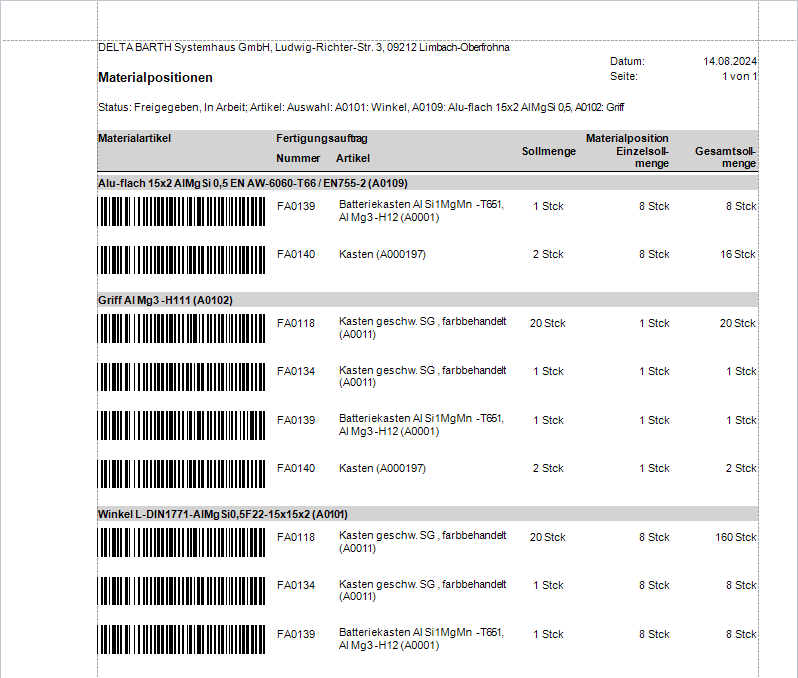 Der Bericht "Materialpositionen" listet alle Materialpositionen von Fertigungsaufträgen mit ihrem Barcode gruppiert nach Materialartikel auf.