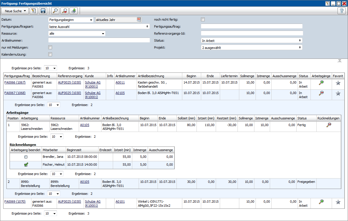Das Portlet "Fertigung: Fertigungsübersicht“ zeigt alle Fertigungsaufträge an. Über die Schaltfläche "Details" (Lupe) können die Arbeitsgänge sowie Rückmeldungen zum Fertigungsauftrag eingeblendet werden.