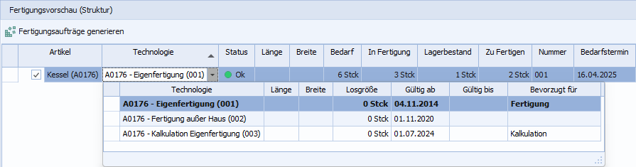 Für jeden vorgesehenen Fertigungsauftrag können Sie in der Fertigungsvorschau die zu fertigende Menge, das Datum des Fertigungsendes, die Technologie und die Auftragsart ändern. Nach jeder Änderung wird die Fertigungsvorschau neu erstellt, da sich dispositive Änderungen ergeben können oder andere Technologien zur Auswahl kommen.