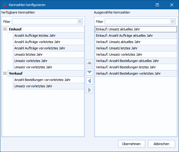Verfügbare Kennzahlen auf der linken Seite, diese sind nach Einkauf und Verkauf gruppiert, können über die Pfeiltasten in den Auswahldialog auf der rechten Seite ("Ausgewählte Kennzahlen") übernommen werden.