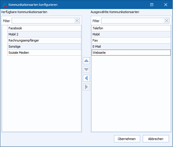 Kommunikationsarten konfigurierenDie Auswahl der Kommunikationsarten kann im Konfigurationsdialog individuell eingestellt werden, welcher über das Zahnrad-Symbol erreichbar ist. Zusätzlich kann die Reihenfolge der Einträge verändert werden.