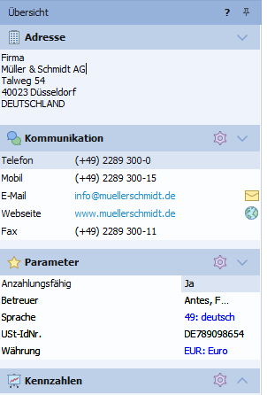 Das Fenster wird standardmäßig auf der linken Seite des Firmenstammes angezeigt und beinhaltet folgende Informationen: •Adressdaten der Firma •Kommunikationsdaten, sofern diese im Fenster "Kontaktdaten" festgelegt wurden •Parameterfavoriten, sofern diese im Fenster "Parameter" festgelegt wurden •Umsatzinformationen und statistische Werte zur Firma