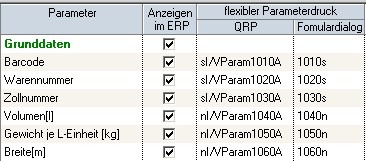 Als Hilfestellung können die Einträge in den Spalten "Flexibler Parameterdruck QRP/Formulardialog" verwendet werden. Diese sind im Fenster "Parametersichtbarkeit" zu finden. Bei den Variablen- und Itembezeichnungen im QRP muss lediglich noch vom Benutzer festgelegt werden, ob der Parameter als Item (I) oder Variable (V) angedruckt werden soll.
