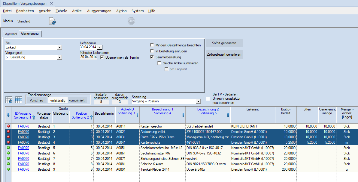 Anschließend können die bedarfsdeckenden Vorgänge sofort oder zeitgesteuert generiert werden.