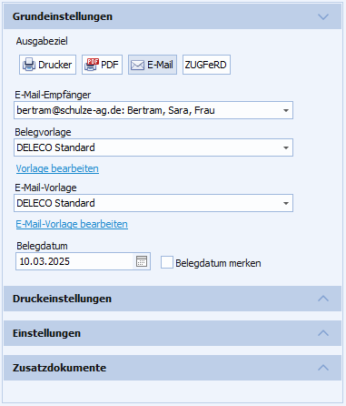 Je nach Ausgabeziel sind entsprechende Einstellungen vor der Belegausgabe möglich. In diesem Kapitel sollen die nachfolgenden Fälle beschrieben werden: 1.Variante: Belegausgabe über Drucker 2.Variante: Belegausgabe im PDF-Format 3.Variante: Belegausgabe per E-Mail 4.Variante: Spezialfall Rechnungsausgang: Belegausgabe per E-Mail im E-Rechnungsformat (ZUGFeRD bzw. XRechnung)