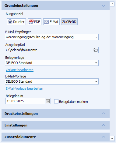 1. Variante: Belegausgabe über DruckerFür den Fall, dass Sie z.B. Ihren Lieferschein der Ware beilegen wollen, wählen Sie das Ausgabeziel "Drucker" im Bereich der Grundeinstellungen.
