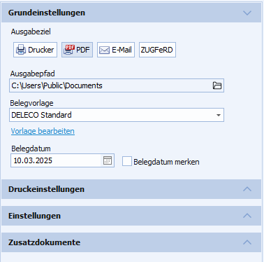 Hier müssen Sie Ihren Ausgabepfad auswählen, d.h. festlegen, wo die PDF-Datei abgespeichert werden soll. Der Ausgabeordner muss im Netzwerk / auf Ihrem PC vorhanden sein. Üblicherweise ist der Standardausgabepfad, den Sie beim Einrichten des DELECO mit Ihrem Admin vergeben haben, vorbelegt. Sie können hier andere Pfadkonfigurationen wählen.