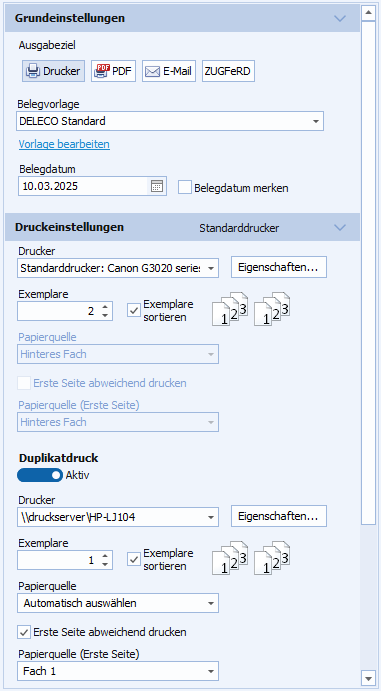 Es öffnen sich dann die Druckeinstellungen und Sie können z.B. Ihren Arbeitsplatzdrucker auswählen. Konfigurieren Sie nun, wie viele Exemplare Sie benötigen, ob Sie ggf. eine abweichende erste Seite haben (z.B. auf Briefpapier) und wählen Sie, ob ein Zweitdruck (Duplikatdruck) erforderlich ist. DELECO bietet Ihnen die Möglichkeit, den Zweitdruck auf einem anderen Gerät, z.B. in Ihrem Warenausgang, zu drucken. Nur Wenn der Schieberegler Duplikatdruck auf "aktiv" steht, sind die weiteren Druckereinstellungen eingeblendet. Standardmäßig ist der Duplikatdruck "inaktiv". Wenn Sie diese Einstellungen sowie die Standarddruckeinstellungen (z.B. Seitenanzahl) getätigt haben, wählen Sie "Buchen / Drucken" und der klassische Papierausdruck wird ausgeführt. Ist der Druck erfolgreich verlaufen, ist nur noch die Schaltfäche "Kopiedruck" aktiv.