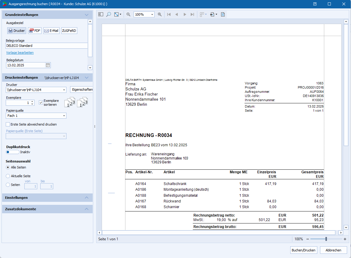 Über den Dialog "Drucken und Buchen" können Belege in den Modulen des neuen DELECO Produktdesigns, z.B. Warenausgang, Rechnungsausgang, Retoure gedruckt werden. Im Dialogfenster ist eine Belegvorschau integriert und im linken Bereich sind vielfältige Einstellungen zum Beleg wählbar, die nachfolgend beschrieben werden.