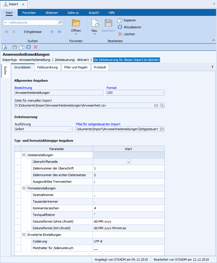 TitelbereichDer Titelbereich des Moduls beinhaltet die Bezeichnung, den Importtyp und den Status der Zeitsteuerung. Ist die Zeitsteuerung aktiv, wird ein farblich hervorgehobener Hinweis angezeigt.