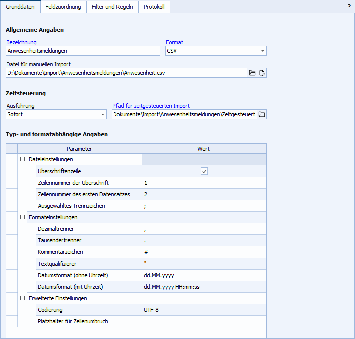Auf der Registerkarte "Grunddaten" werden die allgemeinen Angaben, die Zeitsteuerung sowie typ- und formatabhängige Angaben zu einer Importkonfiguration verwaltet.