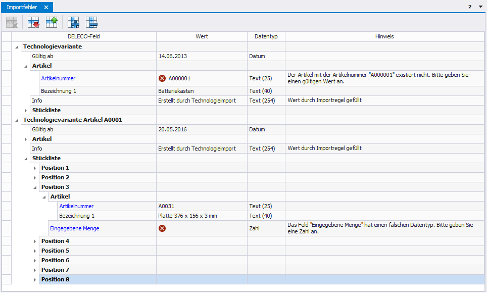 Beispiel: Als Beispiel eines fehlerhaften Imports soll der einer Technologievariante dienen. Das DELECO-Feld, in welches der Wert übertragen werden soll, ist die Artikelnummer. In der Quelldatei ist der Wert "1387111" hinterlegt. In das DELECO-Feld "Artikelnummer" dürfen Daten vom Typ "Text" eingetragen werden, z.B. Text, Zahlen oder eine Kombination aus beidem. In der Spalte "Hinweis" wird der Grund benannt, warum die Technologievariante nicht importiert werden konnte: "Der Artikel mit der Artikelnummer 1387111 existiert nicht." Die Lösung wäre in diesem Fall entweder eine Korrektur der Artikelnummer oder das Anlegen des fehlenden Artikels.