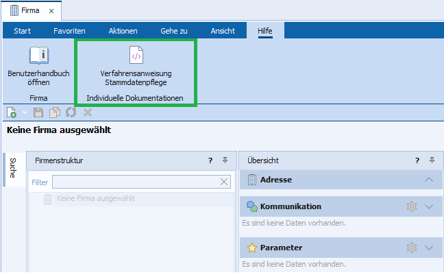 Wurden die notwendigen Daten gespeichert, kann der Nutzer die Dateien in den einzelnen Modulen - im Menüband unter der Gruppe “Hilfe” - als Schaltflächen sehen und verwenden. Die Dokumentationen können vom Nutzer auch als „Favorit“ gekennzeichnet werden.
