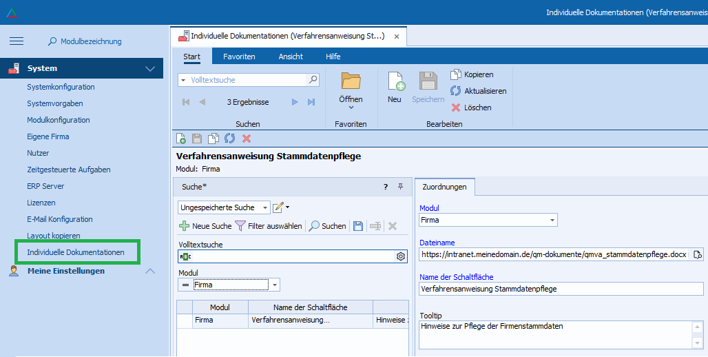 Aufruf: Modulnavigation - Bereich Einstellungen - Modulgruppe System - Modul Individuelle Dokumentationen