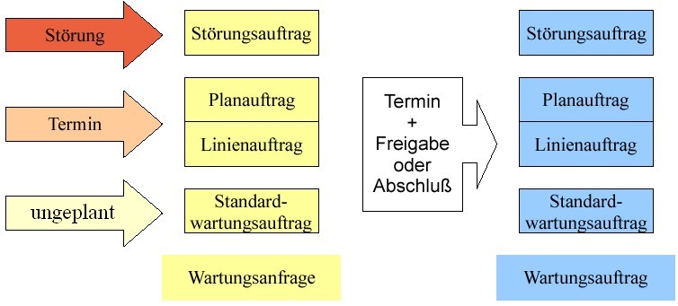 Hinterlegt man eine Wartungsanfrage mit einem Beginntermin und gibt sie zur Abarbeitung frei, wird ein Wartungsauftrag erstellt. Dieser beinhaltet Daten aus der Wartungsanfrage des Objektes und eventuell einen dazugehörigen Wartungsplan inklusive Materialliste und Arbeitsplan. Der Wartungsauftrag und die vorausgegangene Wartungsanfrage haben immer die gleiche ID und und bilden eine logische Einheit.
