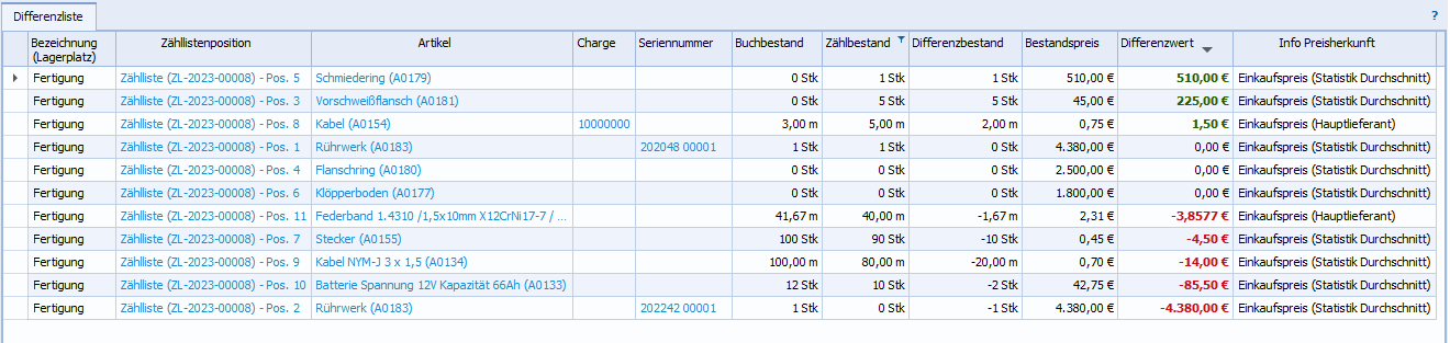 Die Auswertung "Differenzliste" zeigt Differenzen zwischen Buch- und Zählbestand der Zählliste bzw. Inventur auf, mit dem Ziel die erfassten Zähllisten zu überprüfen und bei Abweichungen Nachprüfungen der Inventuraufnahme zu veranlassen. Die Auswertung steht im Ausgabeformat "Tabelle" zur Verfügung.