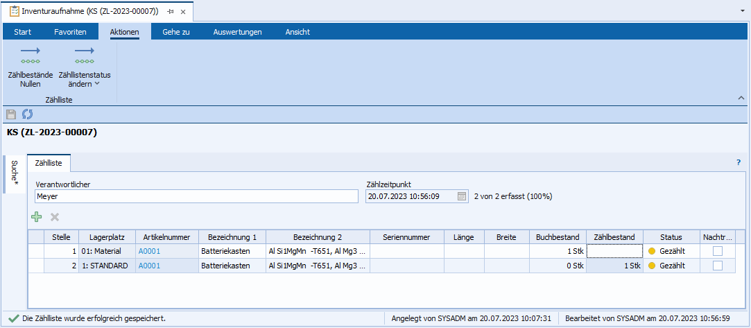 Mit dem Statuswechsel können die auf der Zählliste enthaltenen Artikel wieder auf dem fertig gezählten Lagerplätzen gebucht werden.