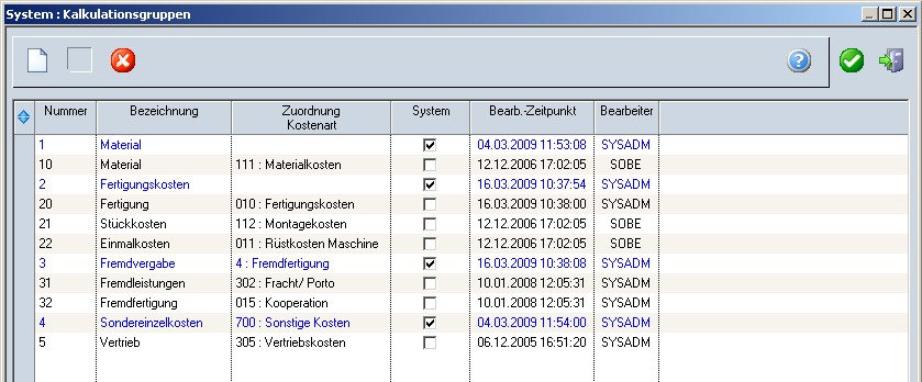 Die in blauer Schriftfarbe dargestellten Hauptkalkulationsgruppen (Material, Fertigungskosen, Fremdvergabe, Sondereinzelkosten) sind Systemvorgaben und nicht löschbar; die Bezeichnung kann geändert werden.