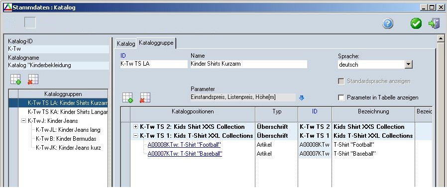 Mittels des Kataloggruppenbaumes lassen sich Artikel übersichtlich anordnen. . Jeder Kataloggruppe lassen sich Katalogpositionen zuordnen. Überschriften fassen mehrere ähnliche Katalogpositionen zusammen. Dabei werden die Bilder und die Beschreibung der Überschrift verwendet und die Katalogpositionen in einer Tabelle zusammengefasst dargestellt.