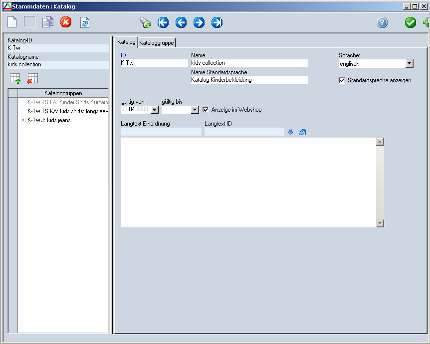 Die angezeigte Sprache des Kataloges kann geändert werden. Wird die Sprache geändert, muss der Katalog neu geladen werden. Sprachabhängige Daten sind: Katalogname, Katalogbeschreibung, Kataloggruppenname 1 und 2, Katalogpositionsbezeichnung 1 und 2.