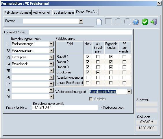 Vorgehensweise: 1.Alle benötigten Werte (Mengen, Preise, Rabatte, Preiseinheit, usw.) in den Comboboxen auswählen. Diese werden damit den in der Berechnungsvorschrift zu verwendenden Bezeichnungen F1 ... F8 zugeordnet. 2.Berechnungsvorschrift (Formeltext) unter Verwendung der Faktoren eingeben. 3.In der Feldsteuerung diejenigen Werte deaktivieren, die bereits in der Berechnungsvorschrift einberechnet werden, damit diese nicht doppelt einberechnet werden.