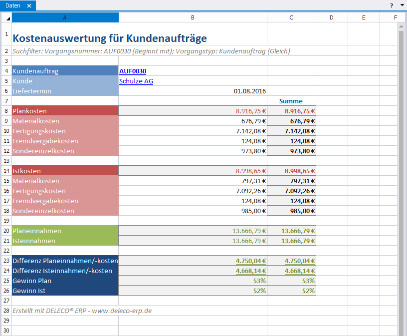 Mit Hilfe der Filter "Vorgang" und "Vorgangsnummer" kann nach konkreten Kundenaufträgen gefiltert werden. In der Tabellenkalkulation wird der gewählten Kundenauftrag hinsichtlich Plan- und Istkosten entsprechend der Kostenbestandteile aufgeschlüsselt dargestellt. Weiterhin werden die Plan- und Isteinnahmen einander gegenübergestellt und Differenzen ermittelt.