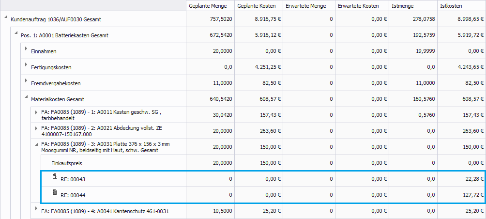 Zu Bestellungen können Anzahlungs- und Schlussrechnungen erfasst werden. Diese fließen - unter Beachtung der getroffenen Systemeinstellung zum Zeitpunkt der Entstehung der Istkosten - in die Berechnung der erwarteten Kosten und Istkosten ein. Die Rechnungen haben in der Kostenauswertung immer die Menge 0 und werden anhand der folgenden Symbole gekennzeichnet: