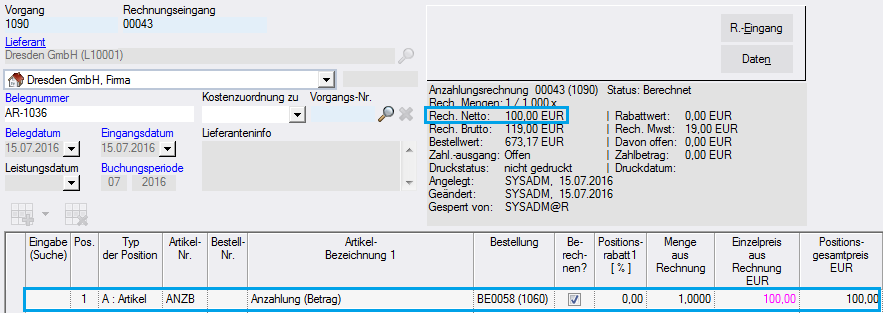 Anzahlungsrechnung: Rechnungsbetrag Anzahlungsrechnung = 100,00 €
