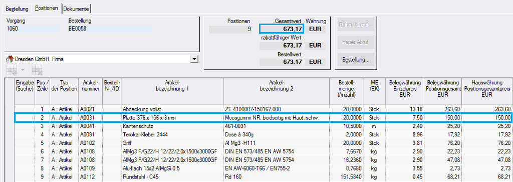 BeispielBestellung: Gesamtwert Bestellung = 673,17 € Gesamtpreis Bestellposition = 150,00 € Menge der Bestellposition = 20