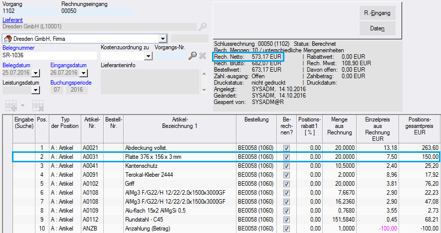 Schlussrechnung: Rechnungsbetrag Schlussrechnung = 573,17 €