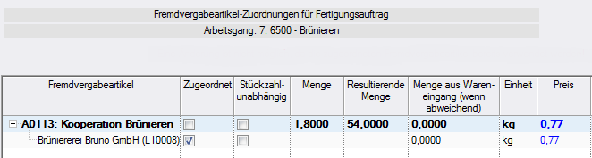 In der Fremdvergabezuordnung werden für den Fremdvergabearbeitsgang die resultierende Menge und der Preis pro Mengeneinheit angezeigt.