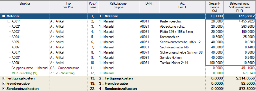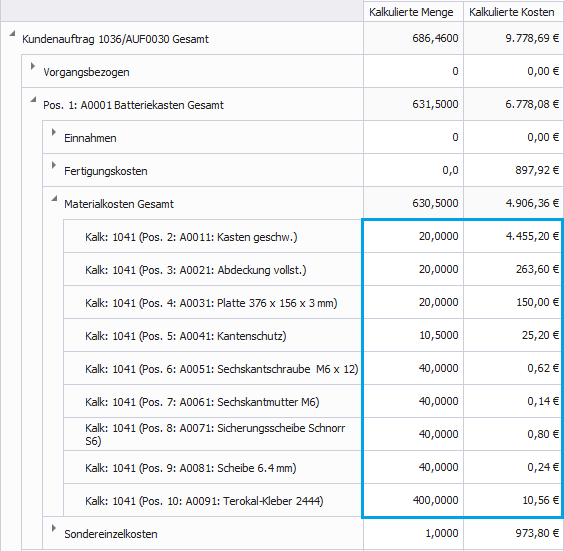 Die kalkulierten Kosten haben ihren Ursprung in der Kalkulation der jeweiligen Angebots- oder Auftragsposition. Ist keine solche Kalkulation vorhanden, wird stattdessen ggf. die Artikelkalkulation verwendet. Die Kostensätze werden dabei für jede einzelne Position der jeweiligen Positionstypen ermittelt. Die Darstellung der Kosten erfolgt gruppiert nach Positionstyp, d.h. nach Material- , Fertigungs-, Fremdvergabe- und Sondereinzelkosten.