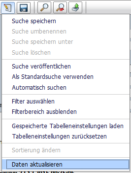 Vor Beginn der Arbeit mit dem Portlet ist es erforderlich die Aktualität der Daten sicherzustellen. Klicken Sie im Menü "Sucheinstellungen" auf "Daten aktualisieren". Nachdem die Anzeige aktualisiert wurde, wird über der Tabelle der Zeitpunkt der letzten Aktualisierung angezeigt.