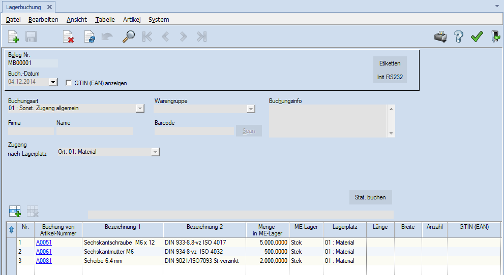 Werden Einkäufe über das Modul Einkauf und Verkäufe über das Modul Verkauf realisiert, erfolgen die Lagerbuchungen für Lagerartikel entsprechend der Moduleinstellungen zu den festgelegten Zeitpunkten automatisch oder nach Abfrage. Auch beim Bearbeiten von Fertigungsaufträgen erfolgen je nach Systemeinstellung die entsprechenden Material- und Erzeugnisbuchungen. Alle anderen Artikelbewegungen für Lagerartikel müssen manuell gebucht werden, damit Bestände, Umsätze und Statistiken ständig den tatsächlichen aktuellen Stand widerspiegeln.