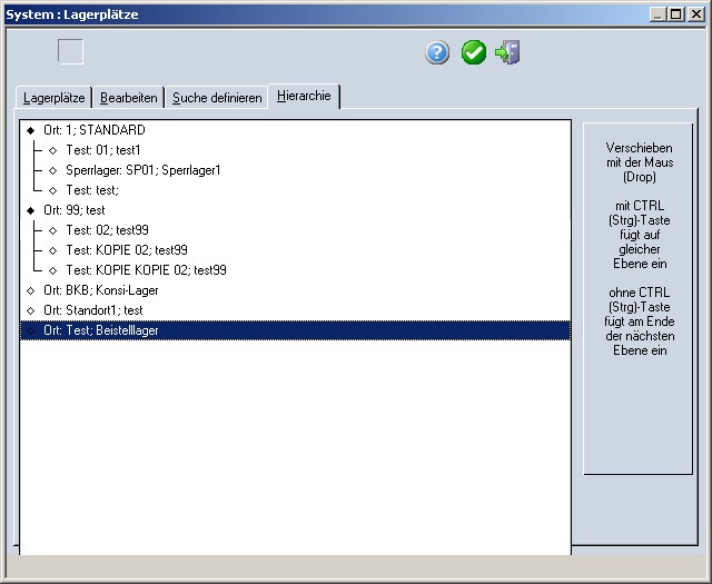 Folgende Einschränkungen müssen beachtet werden: •Lagerorte können nicht untergeordnet werden •Lagerplätze können nur den Lagerorten untergeordnet werden, welche ihnen zugeordnet wurden
