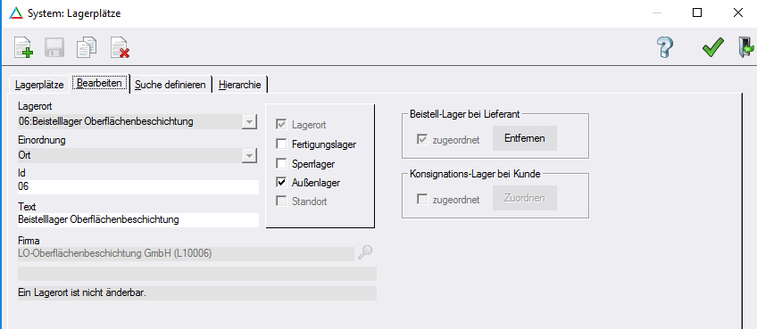 Der Lagerort kann als Außenlager gekennzeichnet werden. Dem Außenlager muss eine Firma zugeordnet werden. Wird einem Lagerplatz ein Ort zugeordnet, welcher als Außenlager gekennzeichnet ist, bekommt der Lagerplatz automatisch dieses Kennzeichen und die Zuordnung der Firma.