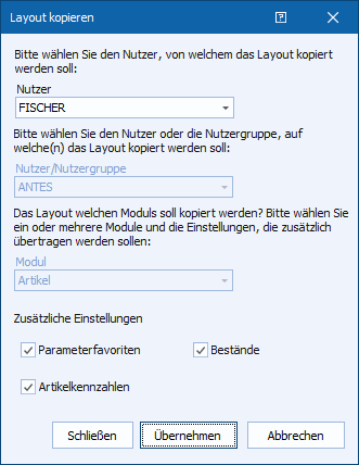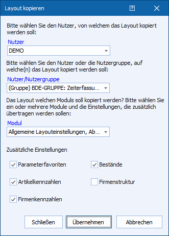 Der Dialog "Layout kopieren" ermöglicht die Weitergabe des Layouts, der Nutzerfavoriten und der Nutzerparameter eines Nutzers für einzelne oder alle Module an andere Nutzer und Nutzergruppen.