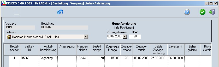 Es werden alle Positionen angezeigt. Über der Tabelle kann der Zusagetermin für alle Positionen gesetzt werden. In der Tabelle in der entsprechenden Spalte können abweichende Mengen oder Zusagen für die einzelnen Positionen erfasst werden. Über den Menüpunkt "Liefer-Avisierung" im Kontextmenü können folgende Aktionen durchgeführt werden: •Zusagetermin und -menge ändern •Zusagetermin aus Liefertermin ergänzen •Zusagetermin aus Liefertermin überschreiben •Zusagemenge aus Bestellmenge ergänzen •Zusagemenge aus Bestellmenge überschreiben •Zusagetermin und -menge löschen |