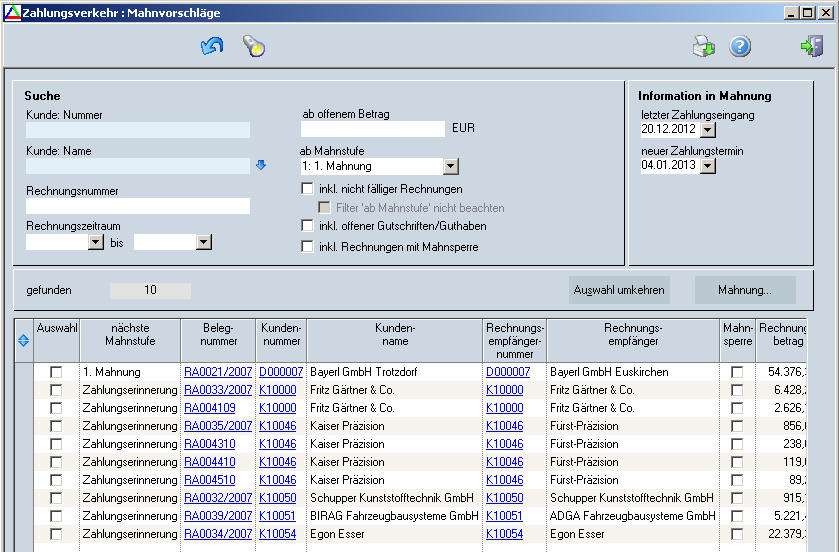Das Mahnwesen gewährt einen detaillierten Überblick über noch unbezahlte Rechnungen. Per Knopfdruck können Mahnungen gedruckt werden. Des weiteren können Mahnstufen zurückgesetzt werden (siehe Mahnstufe zurücksetzen).