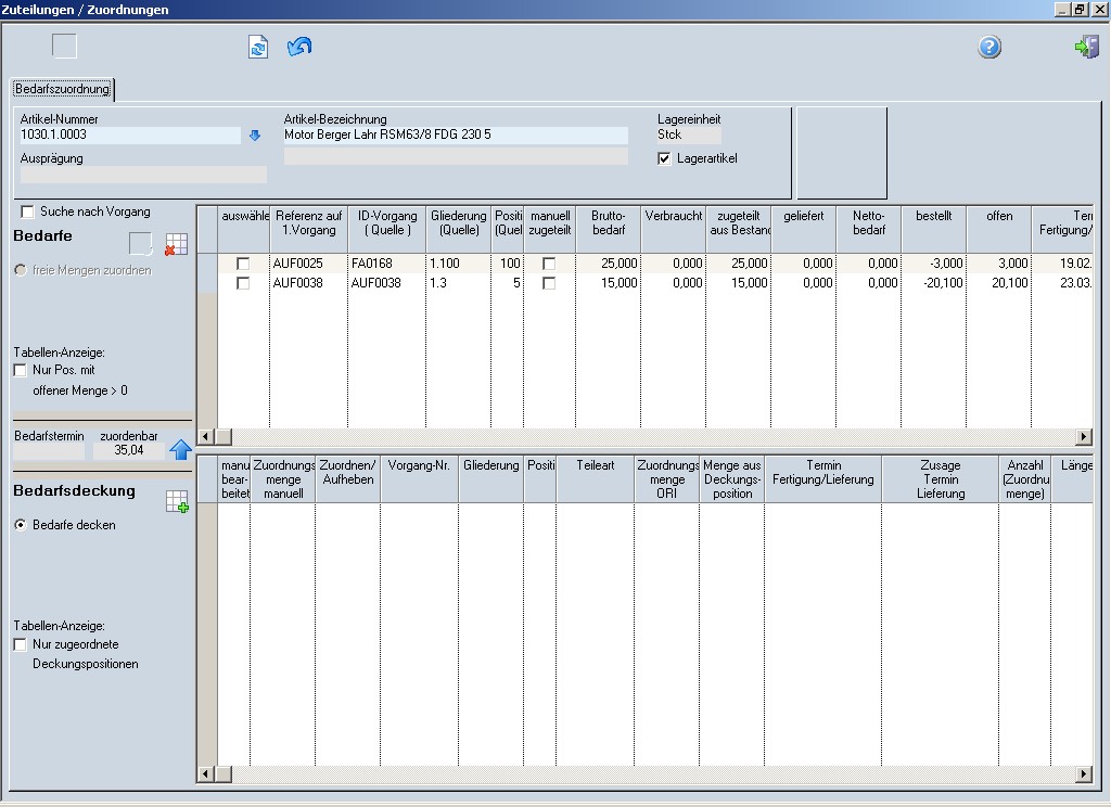 Es wird der ausgewählte Artikel angezeigt. In der oberen Tabelle werden alle Bedarfspositionen des Artikels angezeigt. In der unteren Tabelle sind alle Bedarfsdeckungen, d.h. alle zugeordneten Fertigungsaufträge oder Bestellungen zu sehen. Wird in der Tabelle auf den Zeilenanfang doppelgeklickt, werden die zugehörigen Positionen in der jeweils anderen Tabelle blau markiert.